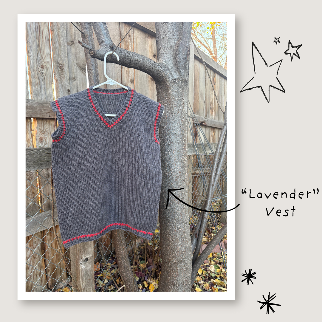 Lavender Smiles Vest in Rowan Magpie Aran: I was originally thinking about making a cardigan for myself out of this gray aran weight yarn. However, my son really was in need of a Sunday sweater or vest for this winter, and as I was winding the first skein out of the five I thrifted, I discovered several breaks in the yarn. This made me panic slightly, worried that perhaps all the skeins were damaged, perhaps by insects. On further inspection, it was only that one skein, thankfully. But it did make the useable yardage even less than what I had in the first place, and I was worried that it would be a bit too squeaky for making a cardigan for me. Also, the yarn is pretty rustic and a bit stiff in the hand, making it seem like it would be a bit uncomfortable on the arms. So I decided a simple vest for my son would be a much better choice. It turned out just as I had hoped, and I look forward to seeing him get some use out of it this winter. I did opt for a twisted rib instead of plain ribbing as given in the pattern, as well as adding a little scarlet stripe using O-Wool 2-ply held double.