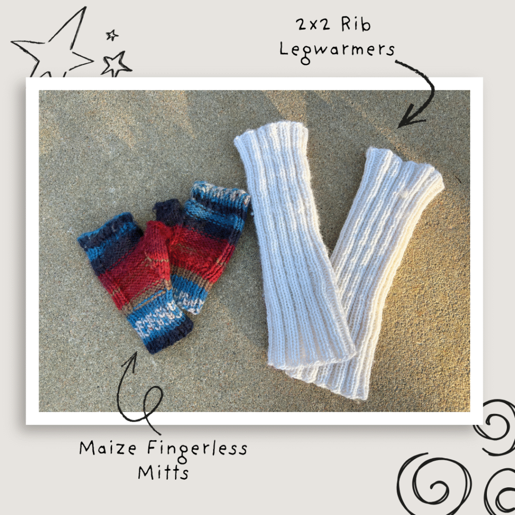 Ribbed Legwarmers in Wool-Ease Origins Roving and Maize Fingerless Mitts in Viking Raggen scraps: If you notice that these both look a little grubby, that’s because they are. I didn’t have time nor inclination to photograph them before my daughter needed to wear them for horseback riding and grooming classes in the cold. She loves both the mitts and the legwarmers so much that I am sure I need to make multiple pairs of both. Good thing they are such quick and easy items to knit up!