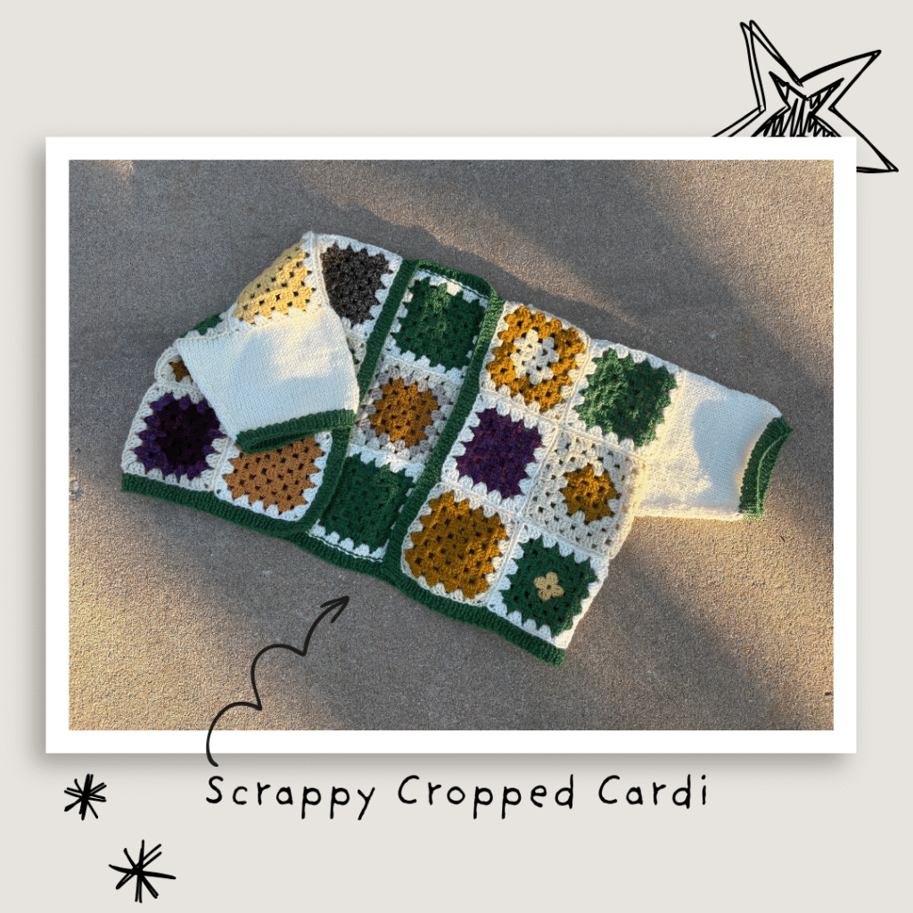 Scrappy Cardi in O-Wool Classic Worsted, Lana D’Oro, and Drops Alaska scraps: The sleeve length on this cropped and oversized cardigan looks a little weird, but it is due to running completely out of the off-white yarn. I was afraid it would feel odd when wearing, but actually, it turned to land just at elbow-length on me and is perfectly comfortable. It is just right as a layering piece with a green turtleneck.